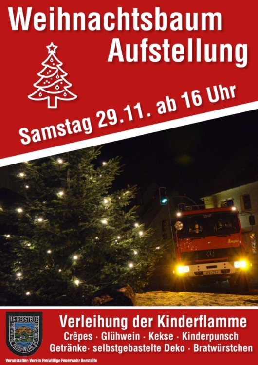 Weihnachtsbaumaufstellung in Herstelle Gemeinsam in die Adventszeit starten Der Feuerwehrverein Herstelle lädt am 29. November ab 16 Uhr zur diesjährigen Weihnachtsbaumaufstellung vor der St.-Bartholomäus-Kirche ein. Die traditionsreiche Veranstaltung bildet für viele Familien den Auftakt in eine gemütliche und festliche Zeit. Ein besonderes Highlight ist die Übergabe der Kinderflamme an die Kinderfeuerwehr. Dieser Moment würdigt die engagierten Nachwuchskräfte und macht ihre Arbeit sichtbar. Für eine gemütliche Atmosphäre sorgen Crêpes, Bratwürstchen, Kekse, Glühwein, Kinderpunsch und weitere Getränke. Außerdem können Besucher selbst gebastelte Dekorationen erwerben, die den heimischen Adventsschmuck perfekt ergänzen. Der Feuerwehrverein freut sich darauf, gemeinsam mit den Bewohnerinnen und Bewohnern einen stimmungsvollen Abend zu verbringen.