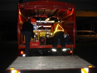 Stromerzeuger und Kraftstoffe auf dem Dekon-P verladen. Zugführer